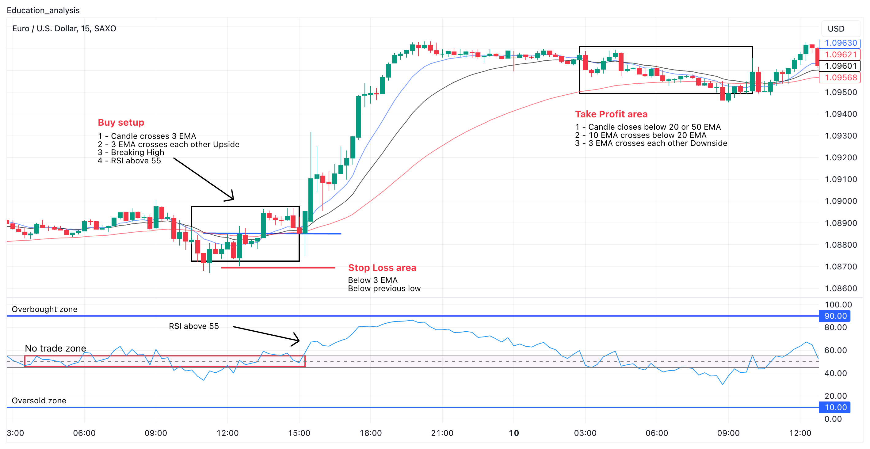 这里有一个简单的设置,包括 3 个指数移动平均线和相对强弱指数 RSI,以及价格水平(支撑/阻力区域、H1 时间框架的趋势线),以及 M15 交易时间框架。