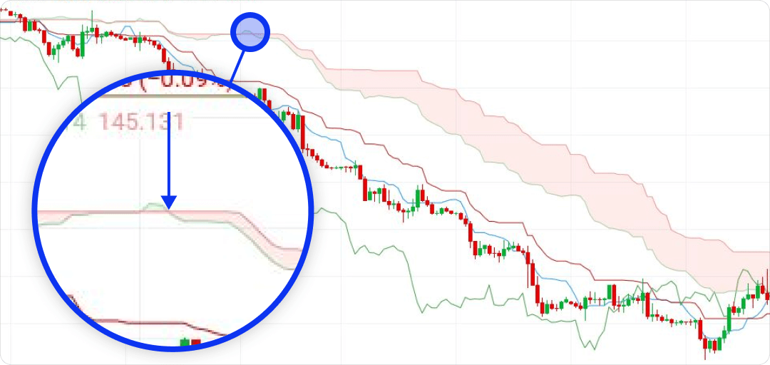 相反地,当先行带 A 向下穿越先行带 B 时,则表明存在看跌交叉。这意味着趋势可能正朝着下跌发展。