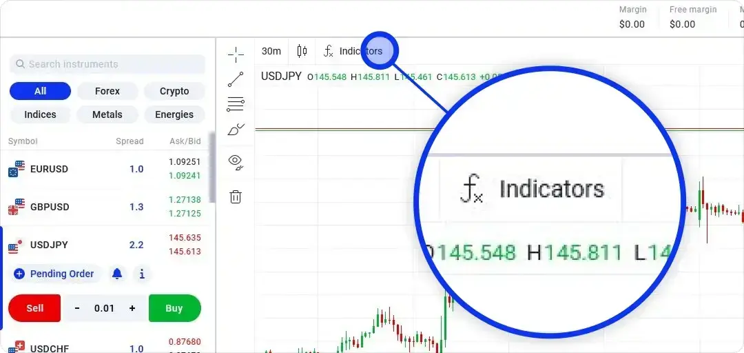要安装一目均衡表指标,打开 Elev8Trader,然后点击图表窗口上方的“指标”按钮。
