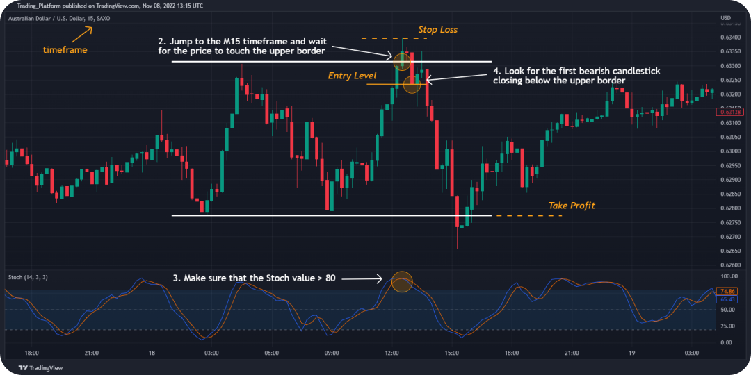 2. 跳到M15时间范围,等待价格触及上边界。